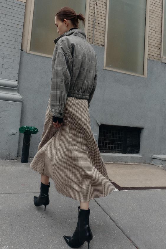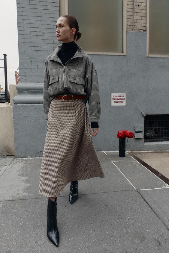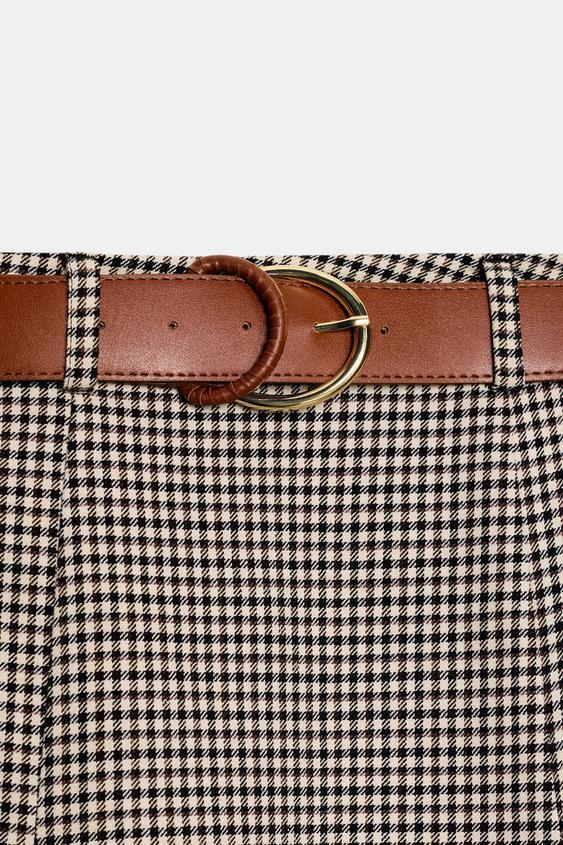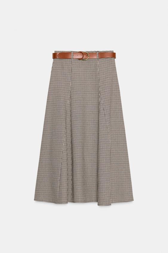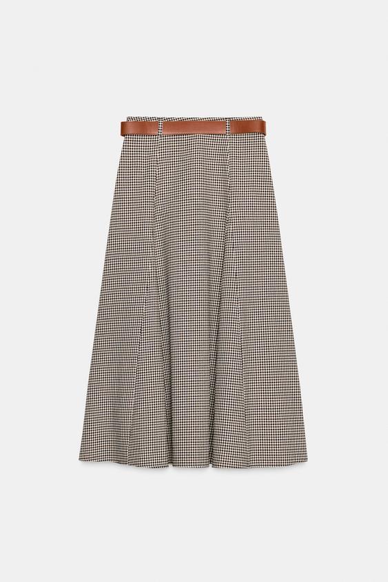 ZARA ЮБКА МИДИ-КЕЙП С РЕМНЕМ И УЗОРОМ «ГУСИНАЯ ЛАПКА», ЧЕРНЫЙ/ЭКРЮ
