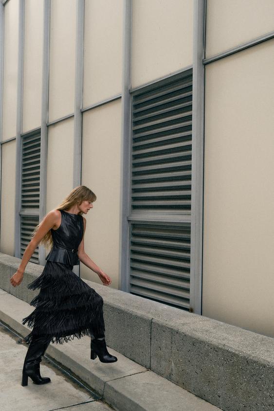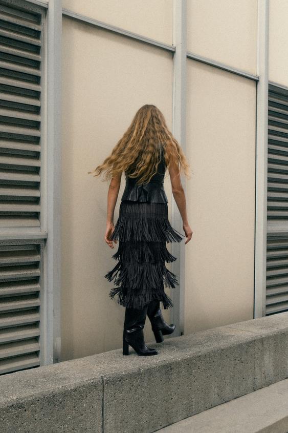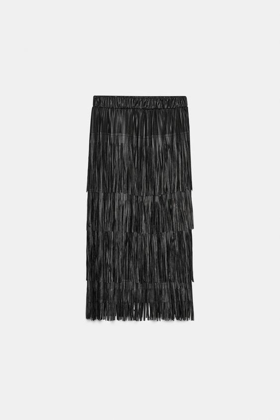 ZARA ЮБКА МИДИ С БАХРОМОЙ, ЧЕРНЫЙ