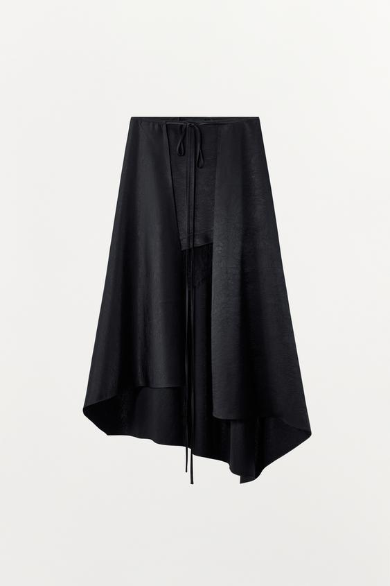 ZARA ЮБКА МИДИ С ЭФФЕКТОМ ЖАТКИ И КРУЖЕВОМ, ЧЕРНЫЙ