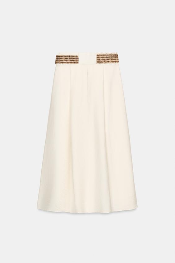 ZARA ЮБКА МИДИ С ПЛЕТЕНЫМ РЕМНЕМ, ЭКРЮ