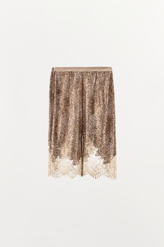 ZARA ЮБКА С ПАЙЕТКАМИ И КРУЖЕВОМ, МЕДНЫЙ