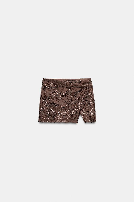 ZARA ЮБКА-ШОРТЫ МИНИ С ПАЙЕТКАМИ И УЗЛОМ, КОРИЧНЕВЫЙ