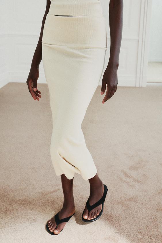 Юбка миди со средней посадкой, из хлопковой пряжи. Пояс на резинке, прямой низ.