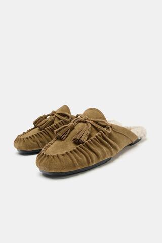 Замшевые лоферы без задника. Стиль «мюли». Сборки спереди. Декоративная кисточка. Внутренняя отделка из искусственной овчины. Круглый нос.