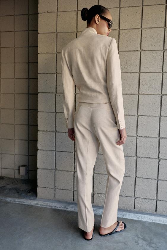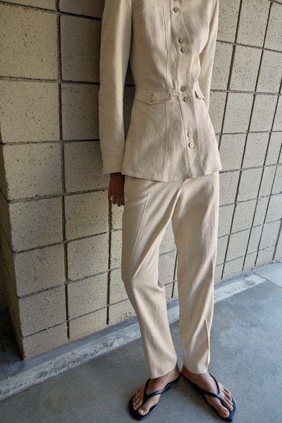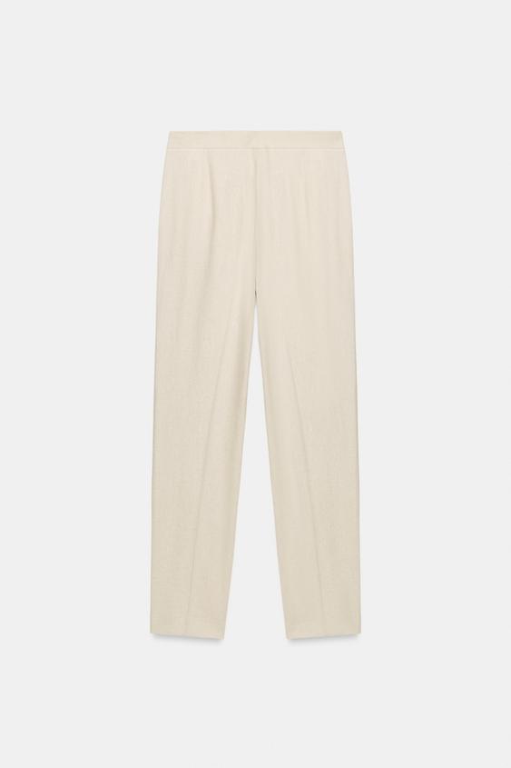 ZARA ЗАУЖЕННЫЕ БРЮКИ ИЗ СМЕСОВОГО ЛЬНА, СВЕТЛО-БЕЖЕВЫЙ