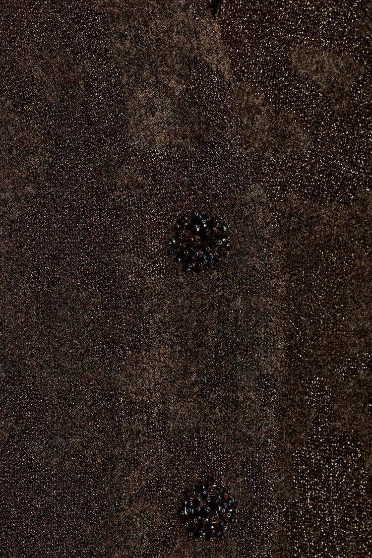 Жакет с V-образным вырезом и длинными рукавами. Передние накладные карманы. Ткань с блестящей нитью. Передняя застежка на кнопки с бусинами.