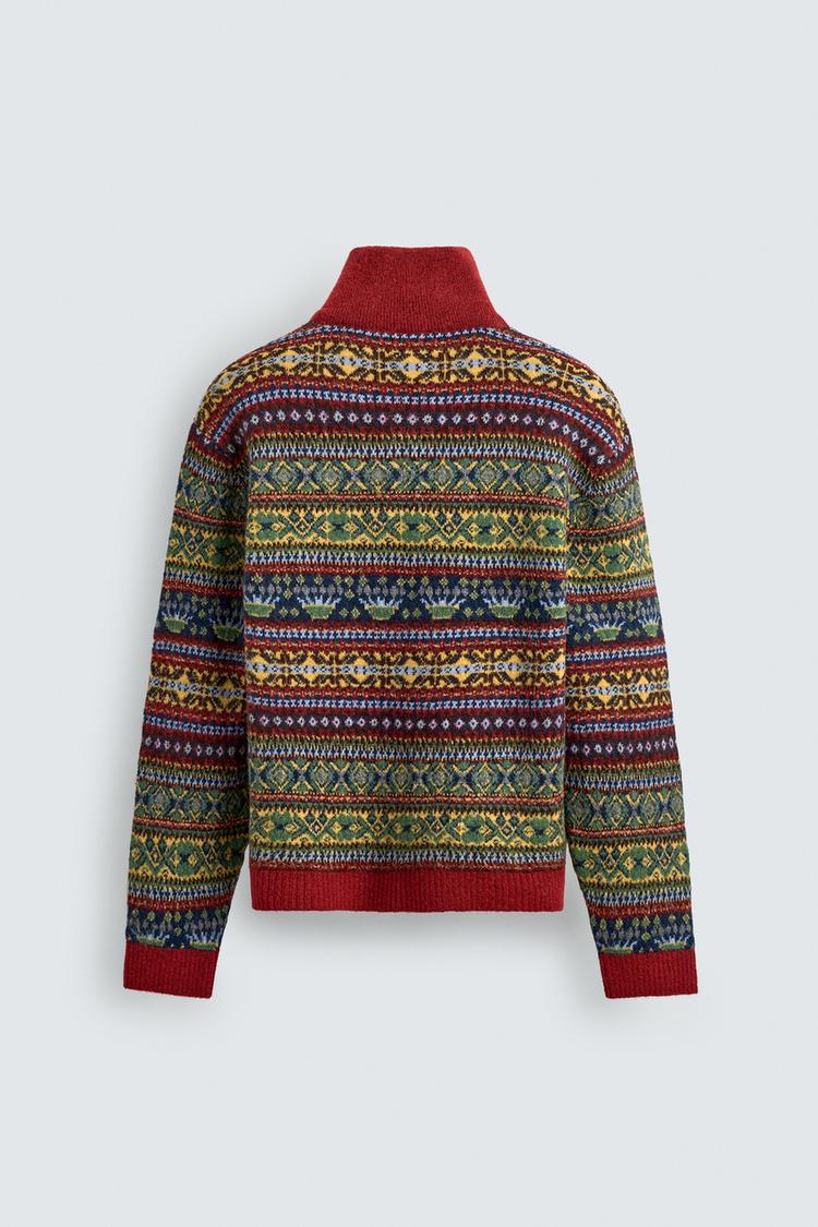 ZARA ЖАККАРДОВЫЙ СВИТЕР С ГЕОМЕТРИЧЕСКИМ УЗОРОМ И ВОРОТНИКОМ НА МОЛНИИ, КРАСНЫЙ