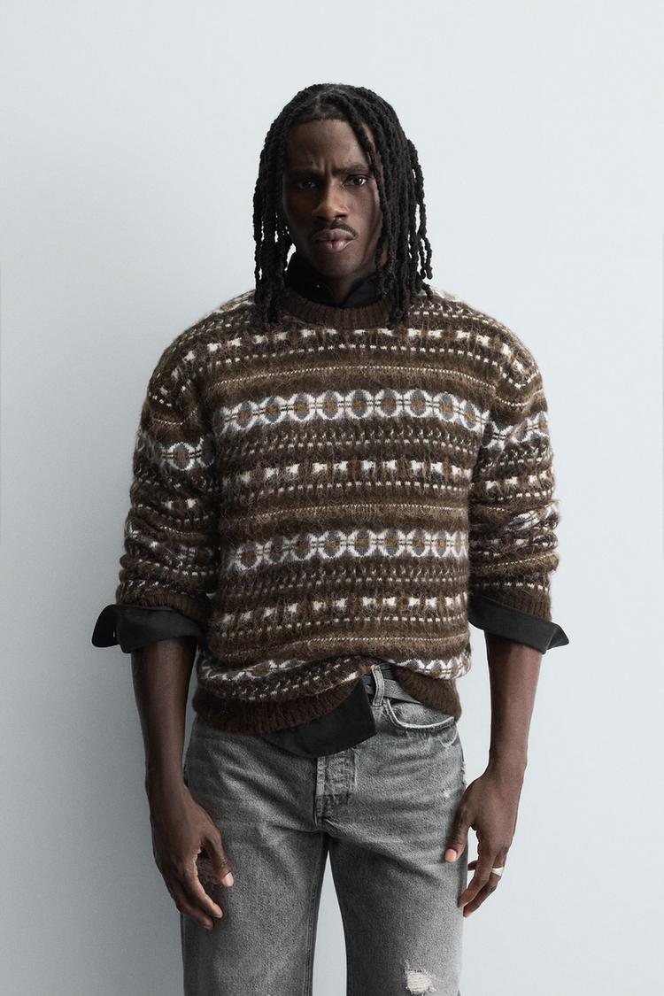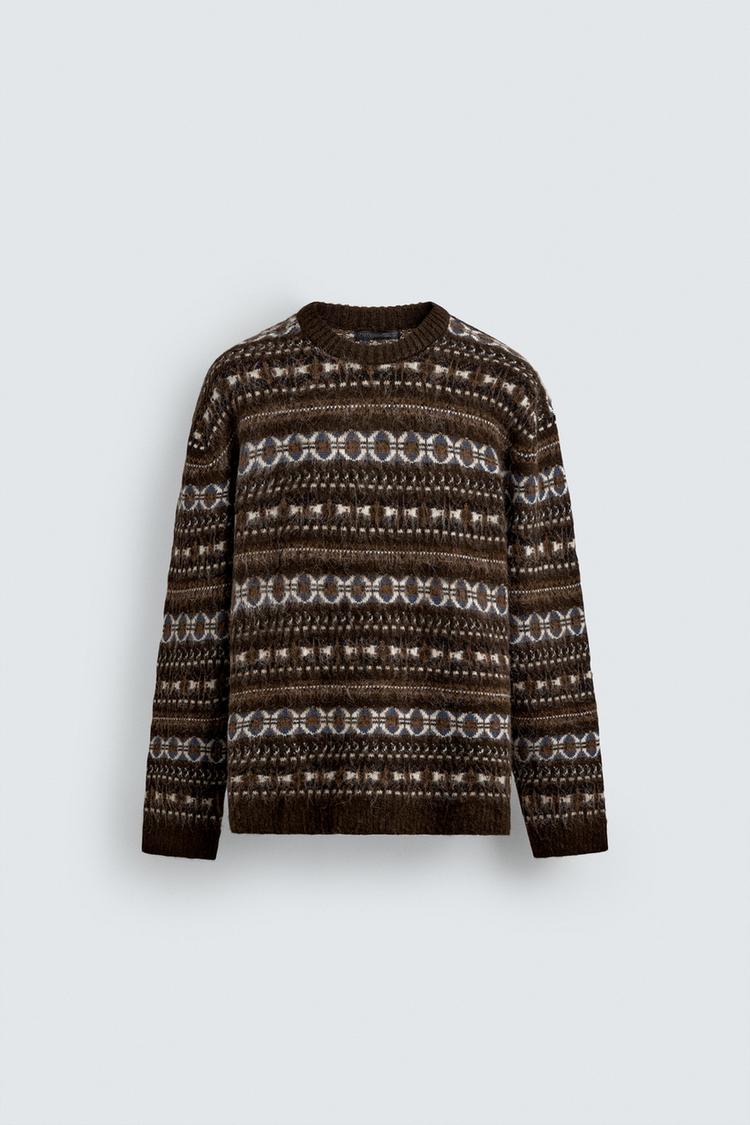 ZARA ЖАККАРДОВЫЙ СВИТЕР С ГЕОМЕТРИЧЕСКИМ УЗОРОМ, КОРИЧНЕВЫЙ