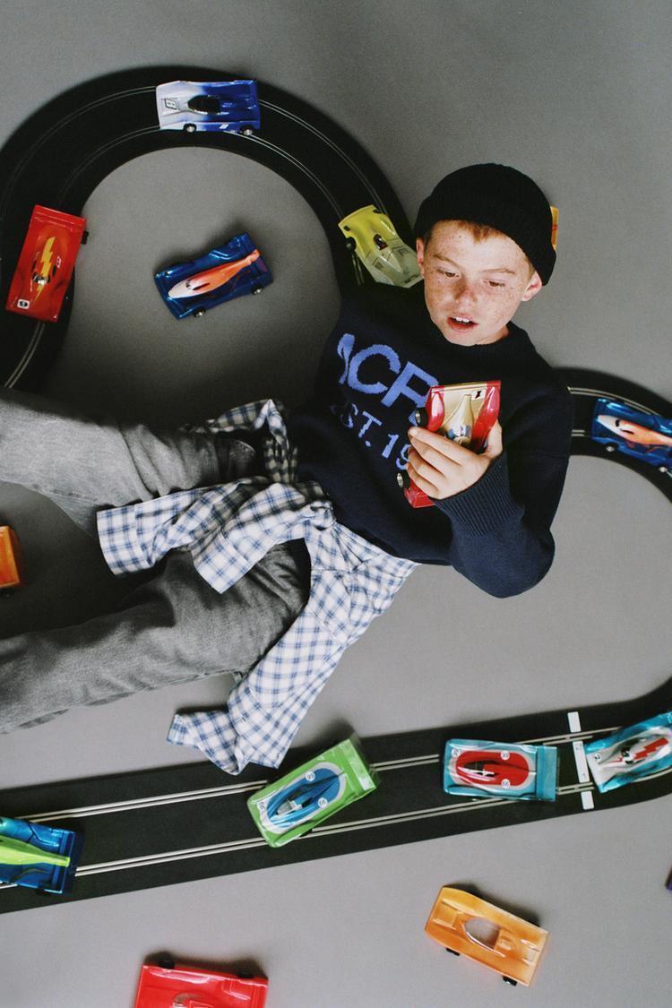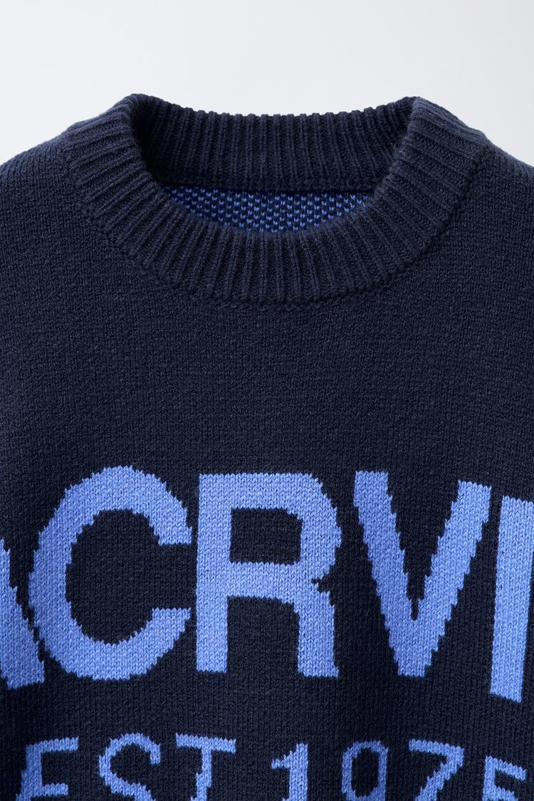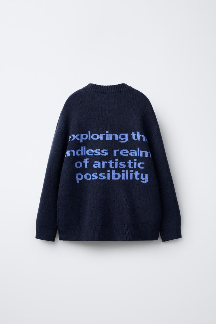 ZARA ЖАККАРДОВЫЙ СВИТЕР С НАДПИСЬЮ, МОРСКОЙ СИНИЙ