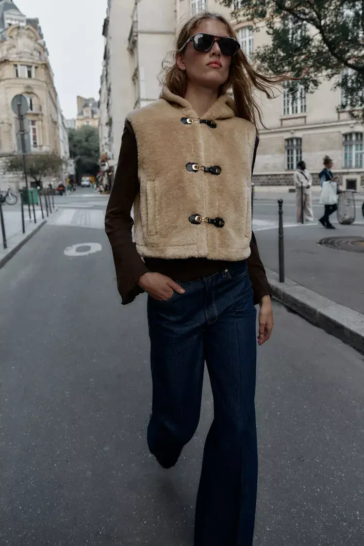 ZARA ЖИЛЕТ ИЗ ИСКУССТВЕННОЙ ОВЧИНЫ С ЗАСТЕЖКАМИ-ТОГГЛ, РЫЖЕВАТО-КОРИЧНЕВЫЙ