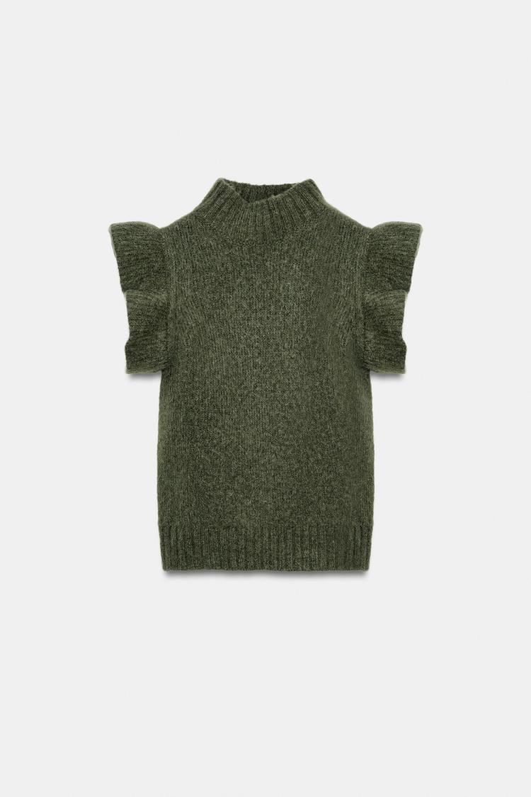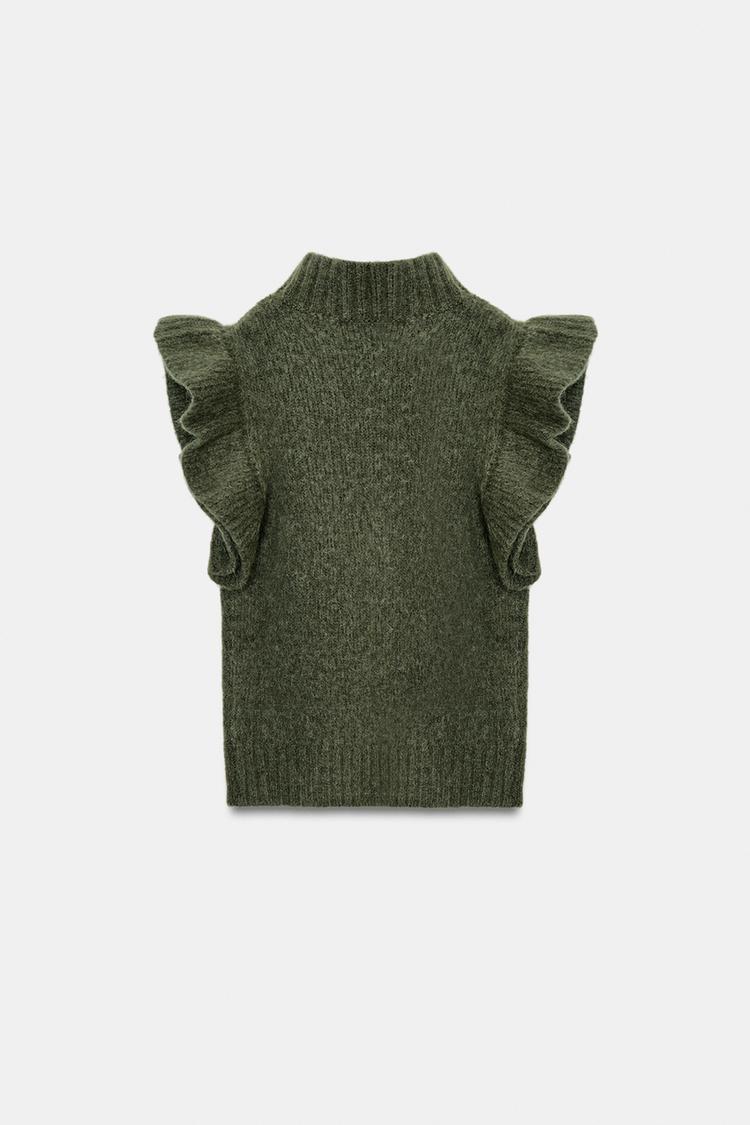 ZARA ЖИЛЕТ ИЗ ШЕРСТИ С ВОЛАНАМИ, ЗЕЛЕНЫЙ