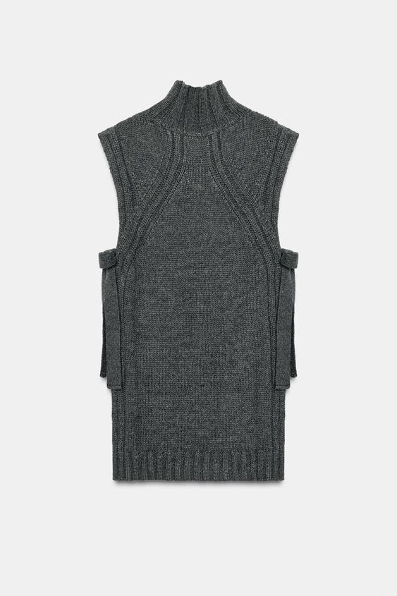 Жилет из смесовой шерсти. Высокий воротник и пройма. Декоративные завязки и боковые разрезы.