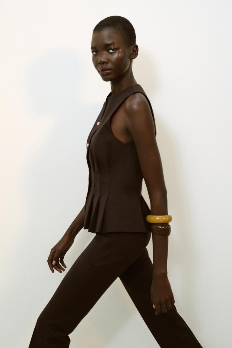 ZARA ЖИЛЕТ С БАСКОЙ И ЗАЩИПАМИ, КОРИЧНЕВЫЙ
