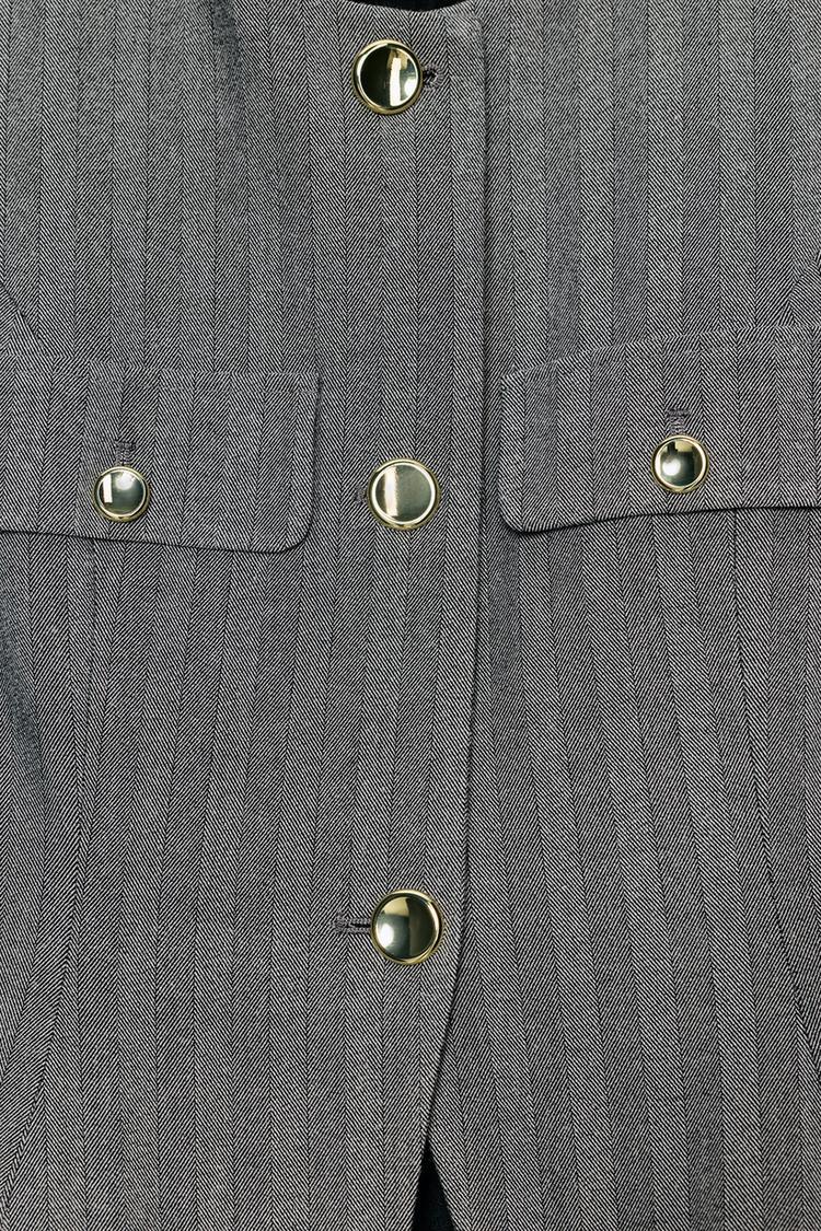 Жилет с круглым вырезом. Декоративные планки спереди с фальшивыми пуговицами. Прорезные передние карманы. Расклешенный низ. Застегивается на пуговицы.
