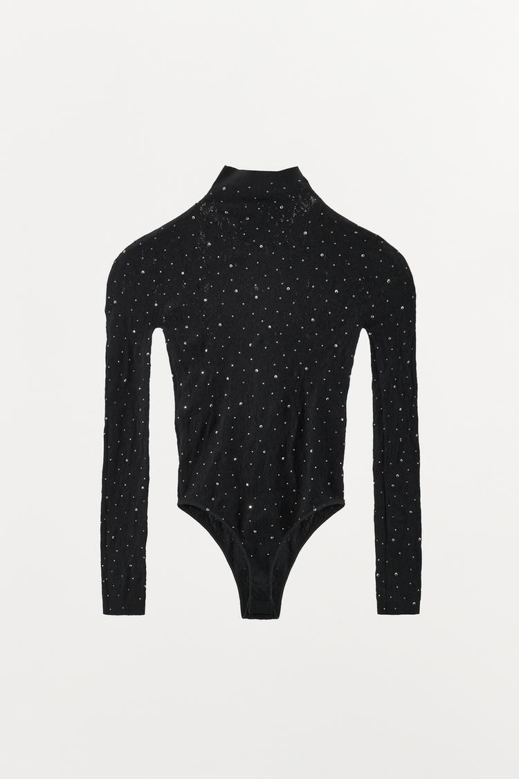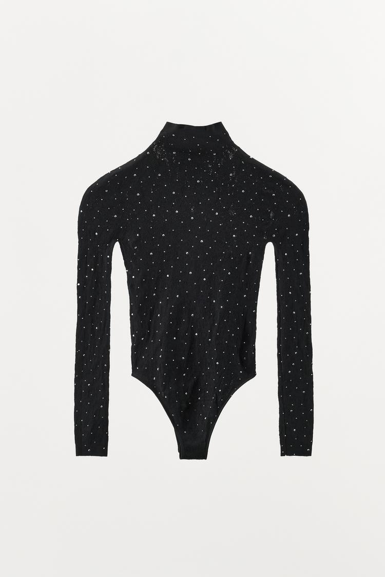 ZARA БЕСШОВНОЕ БОДИ С БЛЕСТКАМИ И КРУЖЕВОМ, ЧЕРНЫЙ