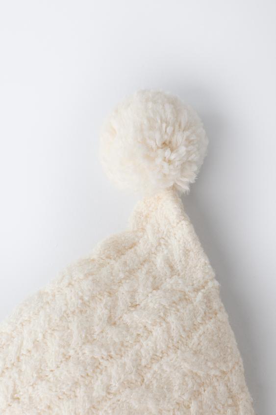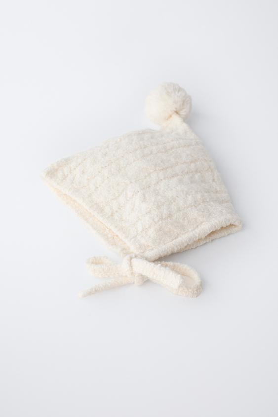 ZARA ЧЕПЧИК ВЯЗКИ «КОСЫ» С ПОМПОНОМ, ЭКРЮ