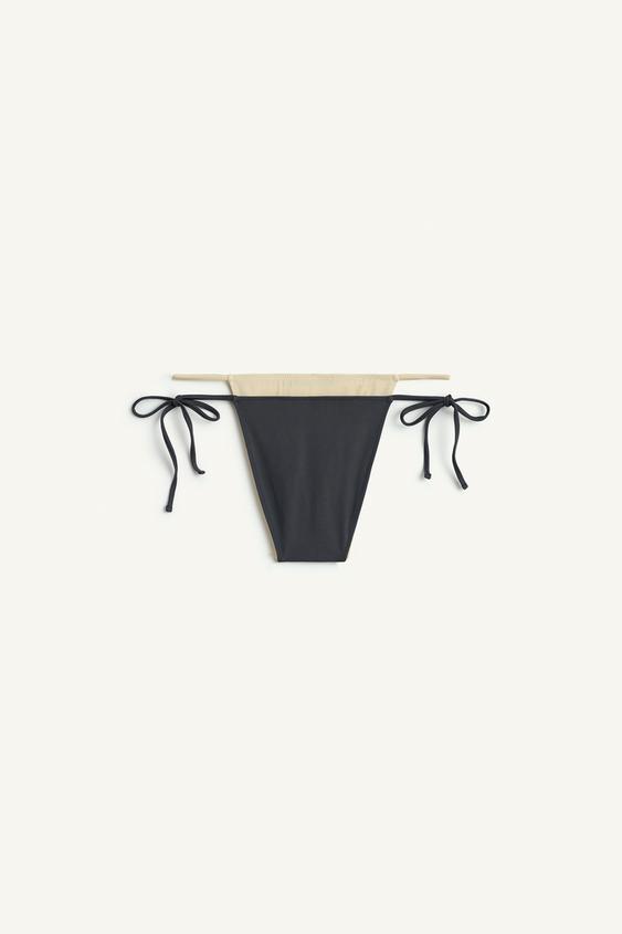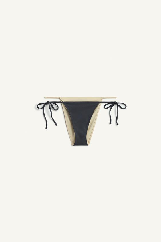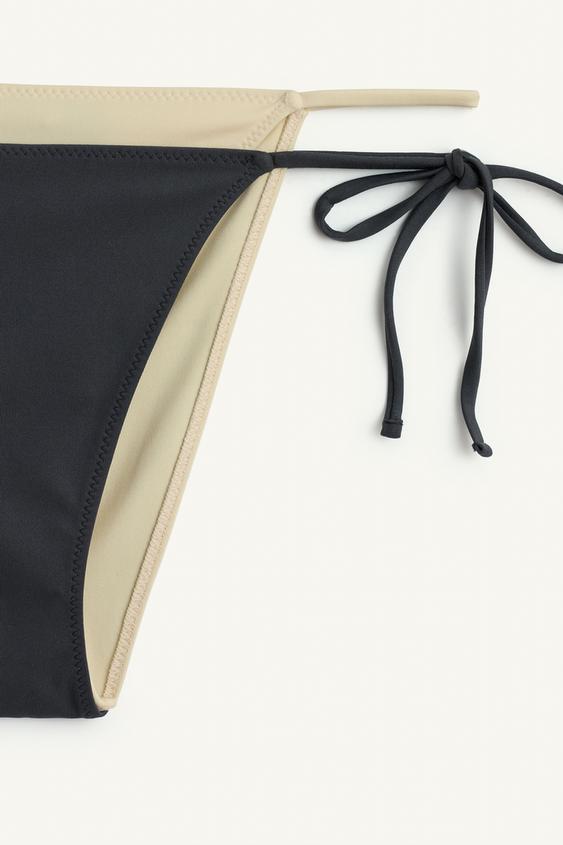 Плавки-бикини с двойным эффектом на средней талии и регулируемыми завязками по бокам.
