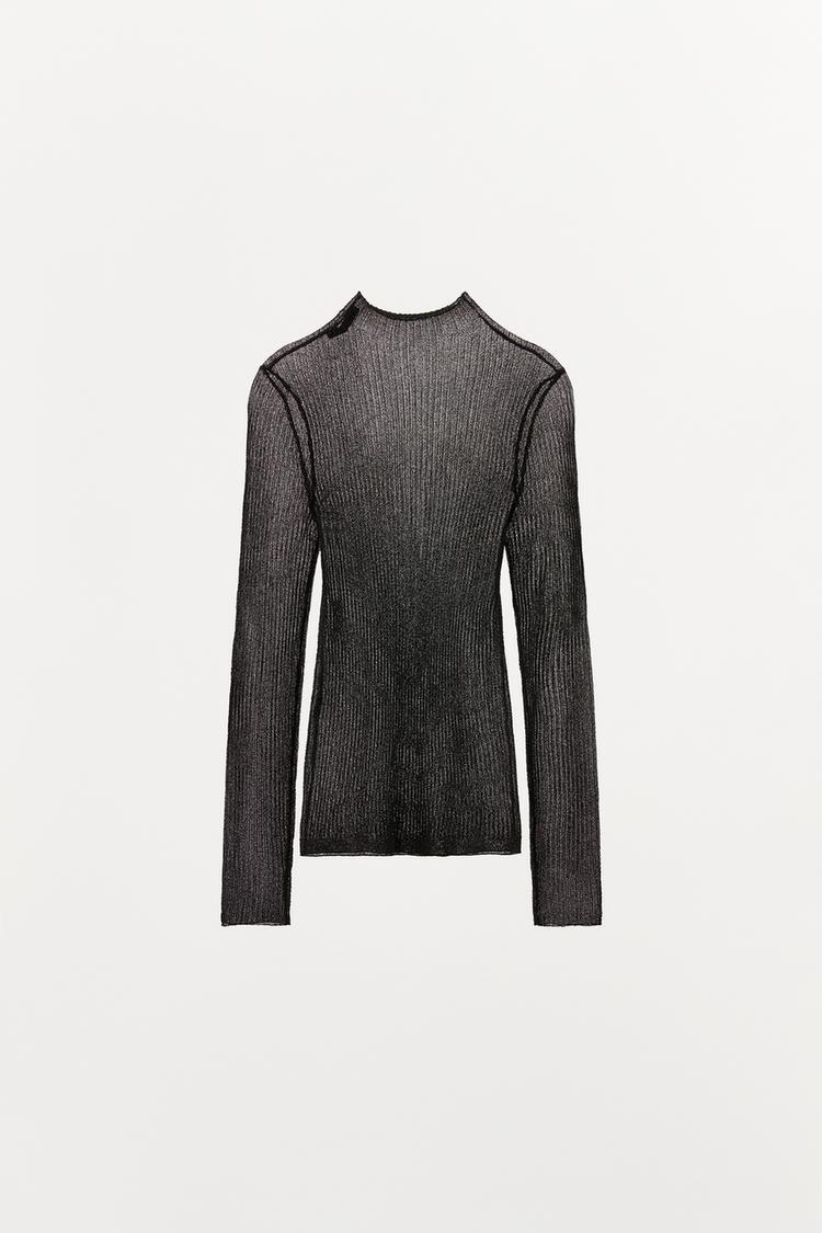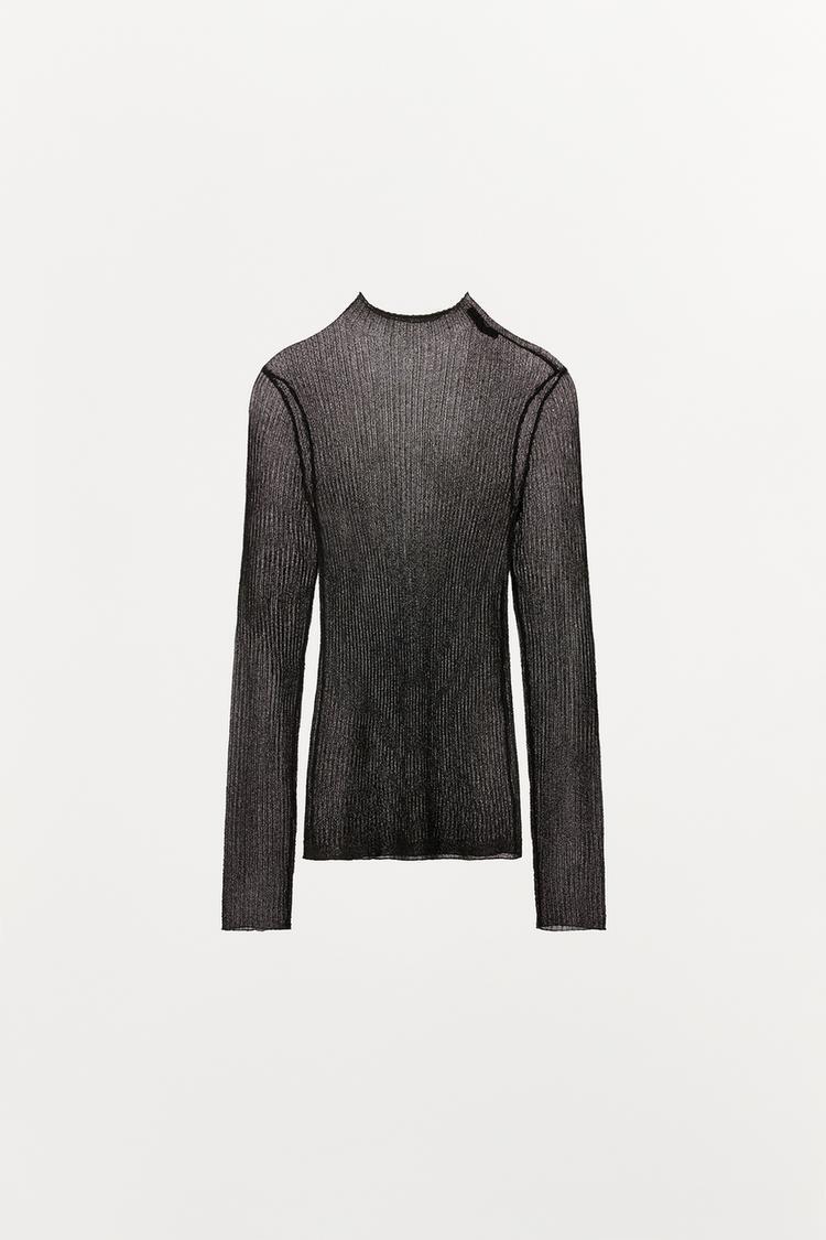 Полупрозрачный тонкий топ с высоким воротником и длинными рукавами. Отделка металлизированной нитью с контрастным сочетанием.